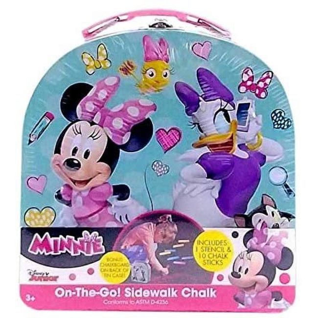 Minnie Mouse Disney Sidewalk Chalk Art Set. Set includes Minnie Mouse lunch box style storage tin. Colorful fun art kit featuring Minnie Mouse. Perfect as Minnie Mouse preschool activities, learning, and more! Perfect as Minnie Mouse preschool activities, learning, and more! Hours of fun for any Minnie Mouse fan, great for travel, family gatherings, gifts, go packs, birthdays and more.