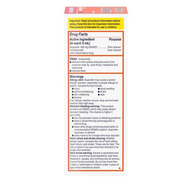 Bring your child fast fever reduction and relief from minor aches and pains due to the common cold and flu. The Children's Motrin Oral Suspension contains 100mg of ibuprofen per each 5 mL of the liquid medicine for kids and toddlers. It contains ibuprofen, a known NSAID pain reliever and fever reducer. Each 5mL contains 100 milligrams of ibuprofen for effective pain and fever relief. This kids' liquid medicine provides up to eight hours of relief from minor aches and pains due to the common cold, flu, sore throat, headache, and toothache. This liquid ibuprofen medicine formula is for children ages 2 to 11 and comes in a kid-friendly original berry flavor. Plus, the enclosed dosing cup makes administering the liquid pain reliever easy for you and your child.