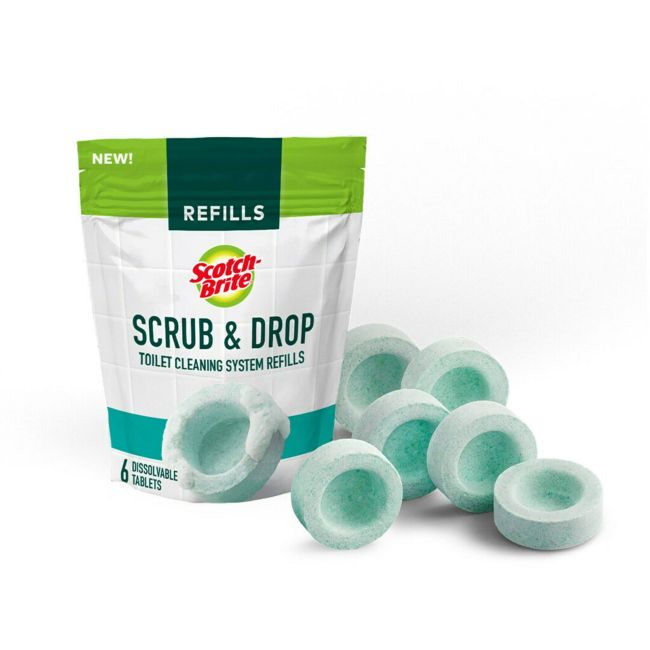 Scotch-Brite Scrub & Drop Toilet Cleaning Tablets offer a new way to clean your toilet. These bathroom scrubbers feature an innovative toilet tablet that can be used like a toilet scrubber brush, then ejected into the water so it can dissolve and leave a fresh citrusy scent. Once its gone, just flush it all away to reveal a clean toilet bowl. To ensure a complete clean, the scrubbing pad tablet is strong enough to clean the bowl. Then, it fizzes and softens to gently wipe your bowl without scratches or waste. Unlike conventional toilet bowl cleaners that carry toilet water back across the floor, flushable Scrub & Drop tablets offer a mess-free clean by leaving everything in the bowl. Whether you use the handle to give the bowl a thorough scrubbing or just drop them in for a quick refresh, these septic-safe tablets leave your toilet with a bright citrus grove scent. Scrub. Drop. Dissolve. Done! WORKS WITH: Scotch-Brite Scrub & Drop Toilet Cleaning System and Scotch-Brite Power Scour Toilet Cleaning System handles SCRUB, DROP, DISSOLVE, DONE: A new way to clean your toilet! Use its dissolving toilet bowl tablets to scrub, then eject it in the water and watch it dissolve. Then just flush it all away to reveal a clean, like-new bowl CLEAN DIFFERENTLY: Scrub hard with power-packed toilet cleaner tablets that clean without scratching, and fizz away for a worry-free flush MESS-FREE CLEAN: Unlike a conventional toilet scrubber that carries toilet water back across the floor. Flushable cleaning tools keep your bathroom cleaner. No water drips. Less plastic waste* (*Compared to non-flushable disposable scrubbers) A FRESHER FINISH: Whether you use the handle to give the bowl a thorough scrubbing or just drop them in for a quick refresh, these septic-safe bathroom scrubber tablets leave your toilet with a bright citrus grove scent.