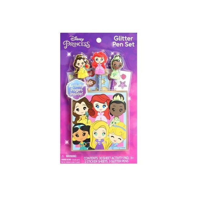 This cute Disney Princess glitter pen activity set is sure to be what every girl wants. Each pen is topped with a fun character topper that girls will love to use. Use the pens and stickers to complete the activities on each page of the activity pad. Girls will have fun using the pens for writing notes or jotting down memories. Makes a cute a little gift that for any Disney Princess fan. Great for travel or taking along with entertain little ones in a restaurant. Lots of fun in a compact set.