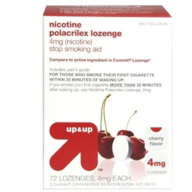 Compare to Nicorette Lozenge active ingredient. Double your chance to successfully quit smoking with Nicotine Polacrilex Lozenge, 4 mg (nicotine), Cherry Flavor (when used as directed with a support program. Many people require several quit attempts to stop smoking). Nicotine Polacrilex Lozenge, 4 mg is a stop smoking aid for those who smoke their first cigarette within 30 minutes of waking up. This product is part of a Nicotine Replacement Therapy, which is designed to wean your body off cigarettes. It helps to regulate, control and gradually reduce your body's nicotine cravings. Smoking has two addictive components, a physical and a mental need for the nicotine in tobacco. Nicotine Lozenge addresses the physical need to smoke by reducing withdrawal symptoms, including nicotine cravings. This product is sugar free, dye free and gluten free. American Cancer Society (ACS) supports nicotine replacement therapy to help people on their journey towards a smoke-free lifestyle. We believe making smart choices for the people, places, and pets in your life should be easy and affordable. And, having quality you can trust should be a given. That’s why you can count on our promise – caring for your everyday in every way. Satisfaction guaranteed – Love it or your money back.