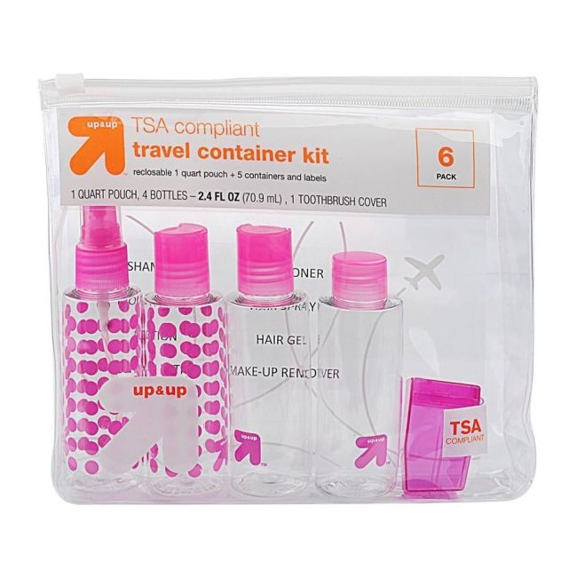 Remove some of the stress from packing liquids and gels when traveling with this 6-Pack Travel Container Kit from up and up?. The six-pack travel container kit includes a reclosable one-quart pouch as well as five plastic containers, one of which is a spray bottle and one is a cover for your toothbrush. It also includes labels so you can easily identify what product you put inside each one: "Shampoo", "Mouthwash", "Lotion", "Suntan Lotion", "Conditioner", "Hair Spray", "Hair Gel" and "Makeup Remover". The TSA-compliant containers are perfect for packing in any bag, from your carry-on or checked luggage for the plane to your backpack for road trips. Gender: unisex.